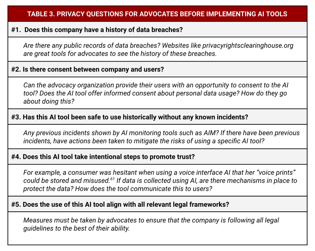Advocates must be proactive to assess privacy impacts before deploying AI tools. We write that “it is imperative that the advocate remain mindful of what it entails when they allow their data — or the data of those they advocate for—to be used for artificial intelligence, as it may be used for ulterior purposes.” We made this convenient table to think through important questions to ask before using an AI tool.
